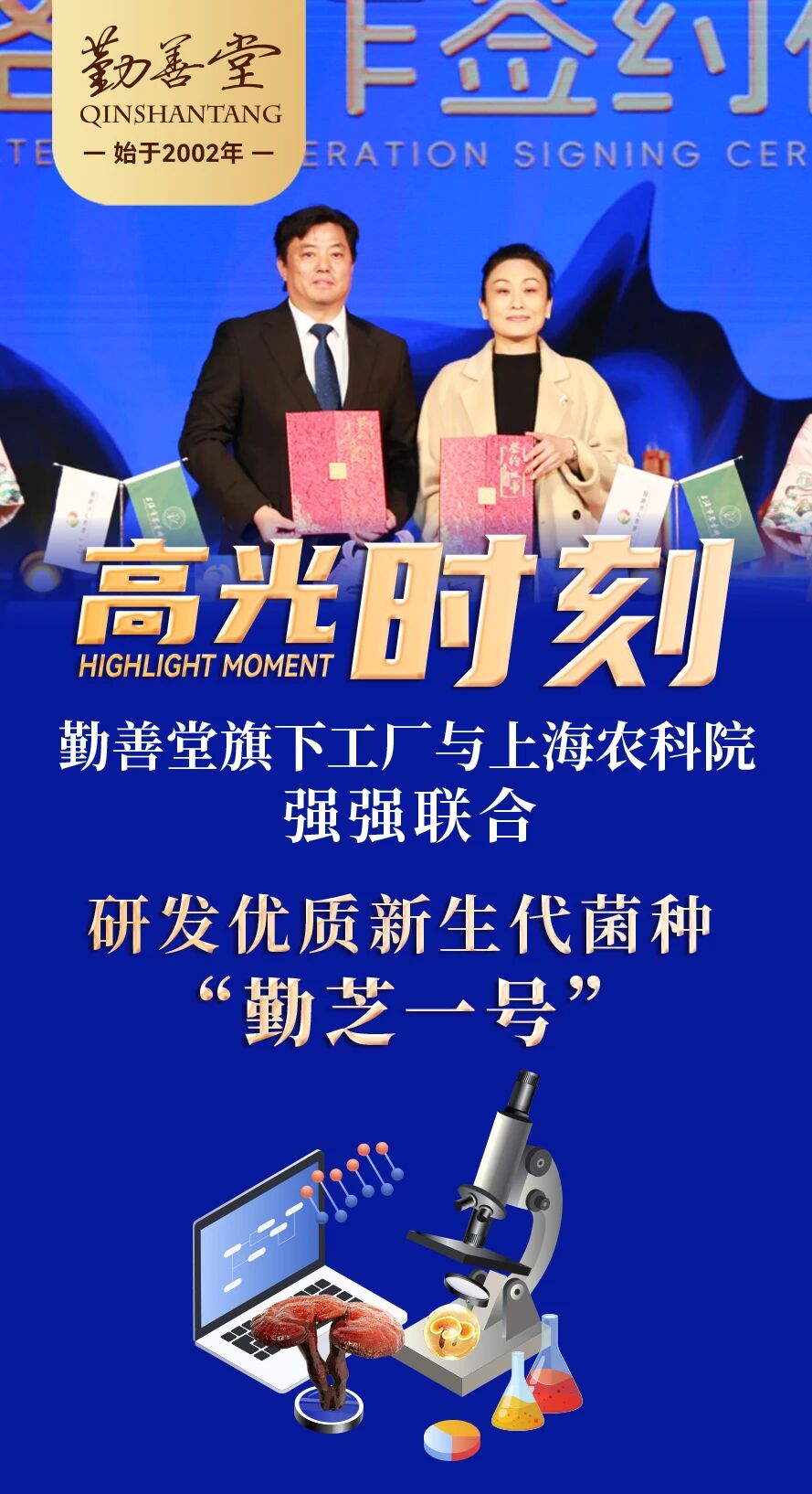 好菌种,是诚信品质之源!2025勤善堂品牌见证大会上,勤善堂旗下工厂与上海农科院签约合作,研发优质菌种“勤芝一号”,以科研赋能品质,为健康产品筑牢诚信根基!