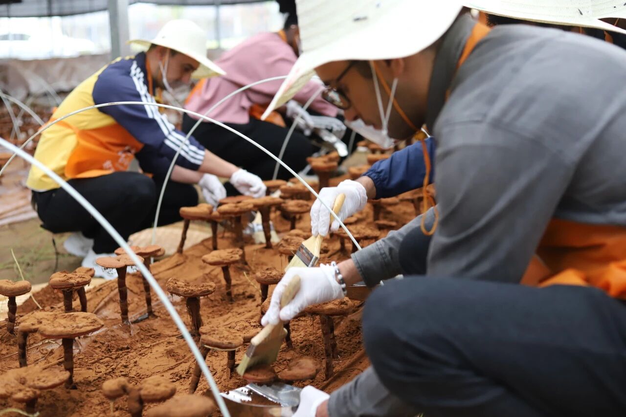 “我们的灵芝基地,是有机灵芝标准化种植示范基地——不仅是优质灵芝的‘培育摇篮’,更在标准规范化种植、科研育种、文化科普传播、产业带动、国际文化交流等多维度发挥核心作用……”在讲解员的带领和解说下,师生团深入灵芝基地。从霍山赤芝的历史渊源到生长周期的关键技术,每一个知识点都刷新着大家对灵芝的认知。